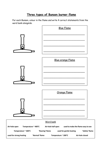Labelling a Bunsen Burner - Labelled diagram - Wordwall Collar, Base, Gas Valve, Chimney, Flame (Inner Cone), Rubber Tubing, Flame (Outer Cone), Air Hole, Heat Proof Surface. Labelling a Bunsen Burner Share by Shonprebble KS3 Y7 Science Working scientifically Like Edit Content More Leaderboard Log in required Theme Log in required Options Switch template Interactives Bunsen Burner worksheet - Liveworksheets.com Bunsen Burner Parts of the Bunsen Burner ID: 1337713 Language: English School subject: General Science Grade/level: 7 Age: 9-11 Main content: Parts of the Bunsen Burner Other contents: Add to my workbooks (11) Download file pdf Embed in my website or blog Add to Google Classroom Label the Bunsen Burner Printout - Enchanted Learning Instructions For the Student: Label the Bunsen burner using the word bank terms below. Extra Information Word Bank air hole, barrel, base, gas tubing, hottest part of flame, inner blue cone of flame, outer, non-luminous flame, regulating collar