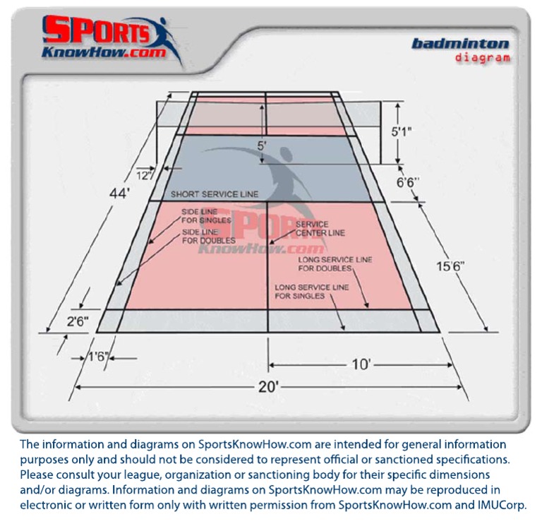 Badminton court: Markings, size and all you need to know Picture by 2015 Getty Images The court has two halves measuring 6.7m (22 feet) each and separated by a badminton net that stands at a height of 1.55m (5 feet 1in) at the ends and dips to 1.52m (5 feet) in the middle. The two playing areas on either side of the net are further vertically divided down the middle demarking the service areas. Badminton court construction: layout and design Badminton court construction: Dimensions of a badminton court. A badminton court measures 13.4m long and 6.1m wide. For singles, the court is marked 5.18m wide. The posts are 1.55m high from the surface of the court. Badminton court construction: Badminton arena design. Badminton arena needs to be designed keeping in mind that the area ... Standard Badminton Court Dimensions and Construction Detail The official size and dimensions of a standard badminton court have featured a length of 13.40 meters. For doubles, the width is 6.10 meters whilst for singles, the width is 5.18 meters. The diagonal length is 14.723 meters for doubles, while for singles, the diagonal length = 14.366 meters. The measurement of the width of the white line is 4.0cm. Badminton Court Diagram - badminton doubles tactics attacking and ... Badminton Court Diagram - 18 images - badminton, badminton, badminton is doubles long service line active during a singles match, badminton quiz physical education grade 6 16 17 staff,