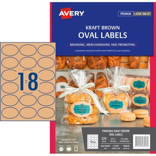 Avery Oval Product Labels Brown Kraft - amazon.com Avery's free online templates and step-by-step instructions will help make these labels easy to use and print, alternatively create your own labels and upload your company logo;Avery Product Labels 18 per Sheet 63.5x42.3mm Brown Kraft Oval Ref L7103-20 [360 labels] Similar item to consider Amazon Basics White Oval Labels, White, Permanent, 270-Pack