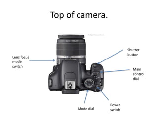 Basic Parts of a Camera and their Functions with Diagram Go through the images given below and try to understand the different parts of the SLR camera. SLR Parts Front and Back View Top View SLR Sensor How do they Function to Produce an Image What you see above is a cutaway illustration of an SLR camera. Light enters the camera's lens and creates an inverted image on the mirror.