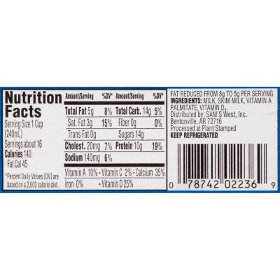 Milk, reduced fat (2%) nutrition facts and analysis. Buttermilk, reduced fat (2%) Milk, not further speficied Milk, reduced fat (2%) contains 122 calories per 244 g serving. This serving contains 4.6 g of fat, 8.2 g of protein and 12 g of carbohydrate. The latter is 12 g sugar and 0 g of dietary fiber, the rest is complex carbohydrate. 2 MILK NUTRITION FACTS LABEL RECIPES All You Need is Food Milk, reduced fat (2%), lactose free. Buttermilk, reduced fat (2%) Milk, not further speficied. Milk, reduced fat (2%) contains 122 calories per 244 g serving. This serving contains 4.6 g of fat, 8.2 g of protein and 12 g of carbohydrate. The latter is 12 g sugar and 0 g of dietary fiber, the rest is complex carbohydrate. From nutritionvalue.org PDF Soymilk 2% Milk - agclassroom.org Soymilk 2% Milk Cinnamon Crunch Cereal Rice Milk Graham Crackers Clementines Yogurt Mango Baby Food Banana Baby Food *Wheat Bread *Pita Bread Flax Seed Rye Flour Wheat Flour Sweetener Sugar Shredded Wheat Cereal Tea Coffee Beans Rice Orange Juice Margarine Sour Cream Cottage Cheese Vitamin A 0% Calcium 0% coon Values or. 2.000 diet. 2% reduced fat milk by Weis Markets, Inc. nutrition facts and analysis. 4. 2% reduced fat milk by Weis Markets, Inc. contains 120 calories per 240 g serving. This serving contains 5 g of fat, 8 g of protein and 12 g of carbohydrate. The latter is 12 g sugar and 0 g of dietary fiber, the rest is complex carbohydrate. 2% reduced fat milk by Weis Markets, Inc. contains 3 g of saturated fat and 19 mg of cholesterol per ...