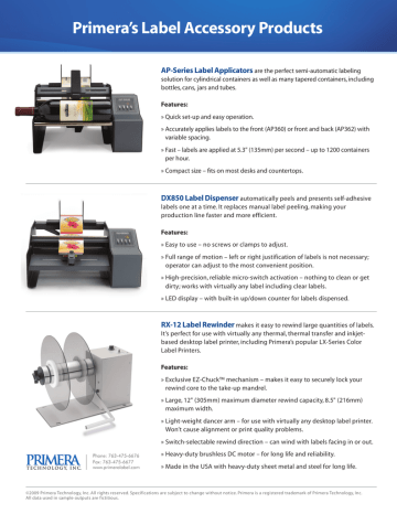 AP-Series Label Applicators - Primera Asia Pacific AP-Series Label Applicators are an ideal accessory to Primera's LX or CX-Series label printers. The applicators can also apply roll-fed, pressure sensitive labels products by most other flexographic, offset and digital presses. Two Models Available AP360 is the base model. It quickly and efficiently applies single labels at a time.
