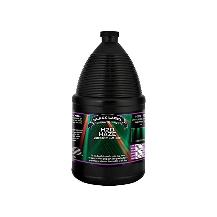 Black Label H20 Haze Water Based Haze Juice - 1 Gallon Haze is very transparent and does not obstruct visibility or sight lines. Black Label Premium Fog Fluids provide a variety of high-impact effects for your next party, light show, stage production, band gig or classic haunted house.