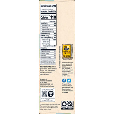 Quaker Apple & Cinnamon Instant Oatmeal - 27.3 OZ - Albertsons Quaker Apple & Cinnamon Instant Oatmeal - 27.3 OZ. Flavor with other natural flavors. No artificial preservatives or flavors. No artificial preservatives, flavors or added colors. Per Packet: 160 calories; 0.5 g sat fat (2% DV); 160 mg sodium (7% DV); 11 g total sugars. 100% whole grain oats. Heart Healthy: Diets rich in whole grain foods and ...