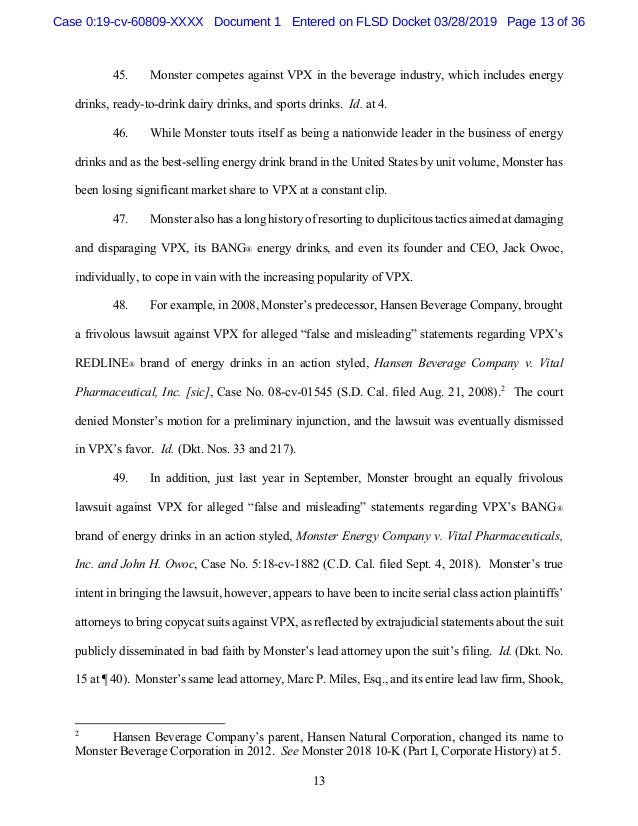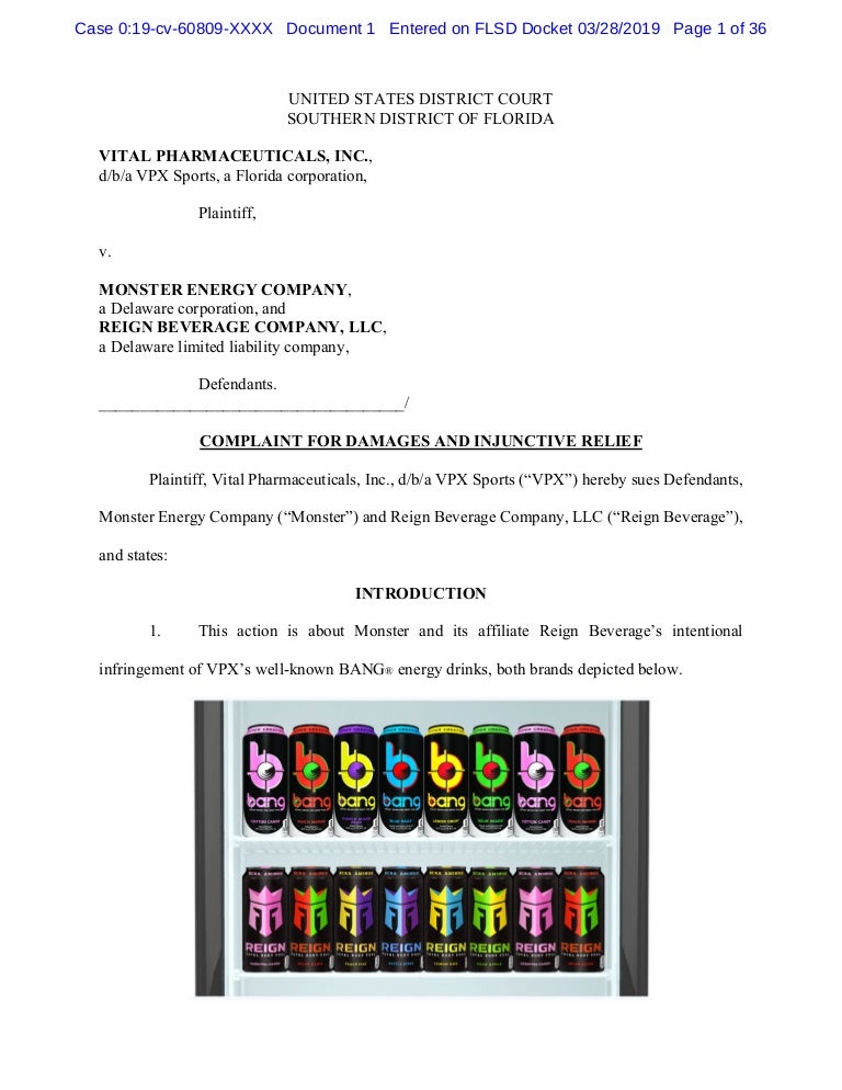 'BANG' Energy Drink Manufacturer Hit With Monster Lawsuit Over Its ... September 06, 2018 at 02:48 PM 1 minute read Raychel Lean Delaware-based Monster Energy Co. has filed a federal suit against a Floridian competitor, energy supplement manufacturer Vital...
