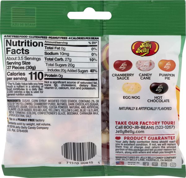Calories in Jelly Belly Jelly Beans (25) and Nutrition Facts - FatSecret Jan 12, 2022 ... Jelly Beans (25) ; Calories. 110 ; Fat. 0 g ; Carbs. 28 g ; Protein. 0 g ; Serving Size, 27 pieces (30 g) ...