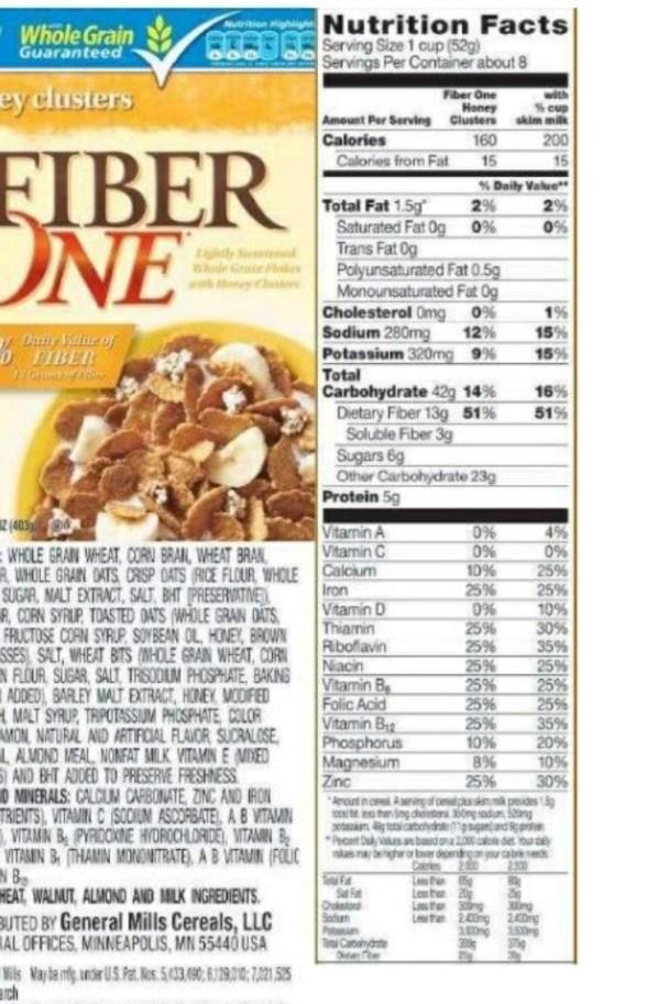 Honey Clusters Cereal • Fiber One Vitamins and Minerals: Calcium Carbonate, Iron and Zinc (mineral nutrients), Vitamin C (sodium ascorbate), A B Vitamin (niacinamide), Vitamin B6 (pyridoxine hydrochloride), Vitamin B1 (thiamin mononitrate), Vitamin B2 (riboflavin), A B Vitamin (folic acid), Vitamin B12. CONTAINS WHEAT; MAY CONTAIN ALMOND INGREDIENTS. Nutrition Facts