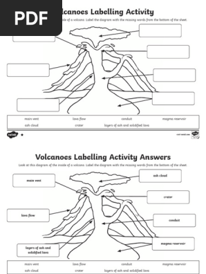 PDF Volcanoes Labelling Activity - Olive Hackney Volcanoes Labelling Activity Answers Look at this diagram of the inside of a volcano. Label the diagram with the missing words from the bottom of the sheet. main vent ash cloud lava flow crater conduit layers of ash and solidified lava magma reservoir main vent lava flow layers of ash and solidified lava ash cloud crater conduit magma reservoir