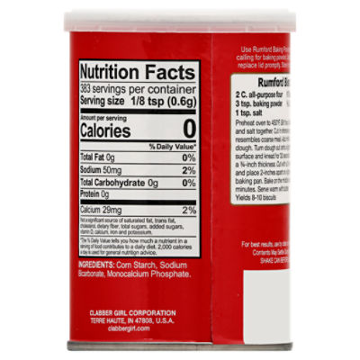 Clabber Girl Baking Powder Nutritional Information ; Ingredients. Corn Starch, Sodium Bicarbonate, Sodium Aluminum Sulfate, Monocalcium Phosphate ; Product Disclaimers. Kosher Pareve ... 365 Aluminum-Free Baking Powder - Nutrition Facts - ReciPal Ingredient list: Cornstarch, Monocalcium Phosphate, Baking Soda (Sodium Bicarbonate). 0. Inspect ... Baking powder - Ingredient - ChefSteps A white powdered substance used as a chemical leavening agent in baked goods. Baking powder is comprised of a weak alkali and a weak acid; typically sodium ...